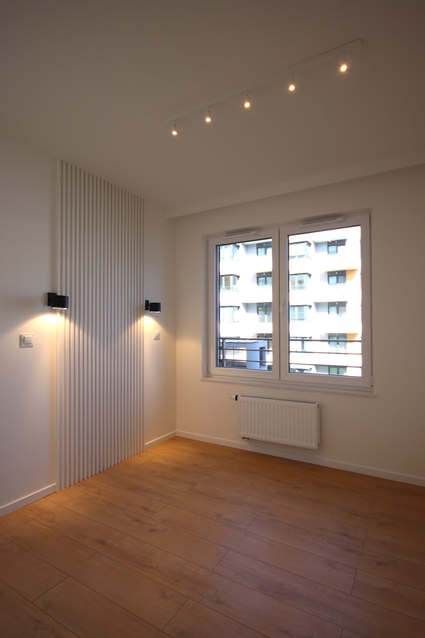 Kolejnym elementem wykończeniowym, który wprowadza do mieszkania nowoczesny akcent, jest sztukateria w formie lameli. Zostały one pomalowane w kolorze ścian, co pozwoliło uzyskać subtelną i spójną dekorację. Lamele nadają wnętrzu głębię, a ich prosta forma wprowadza do przestrzeni nowoczesny, ale nienachalny element.