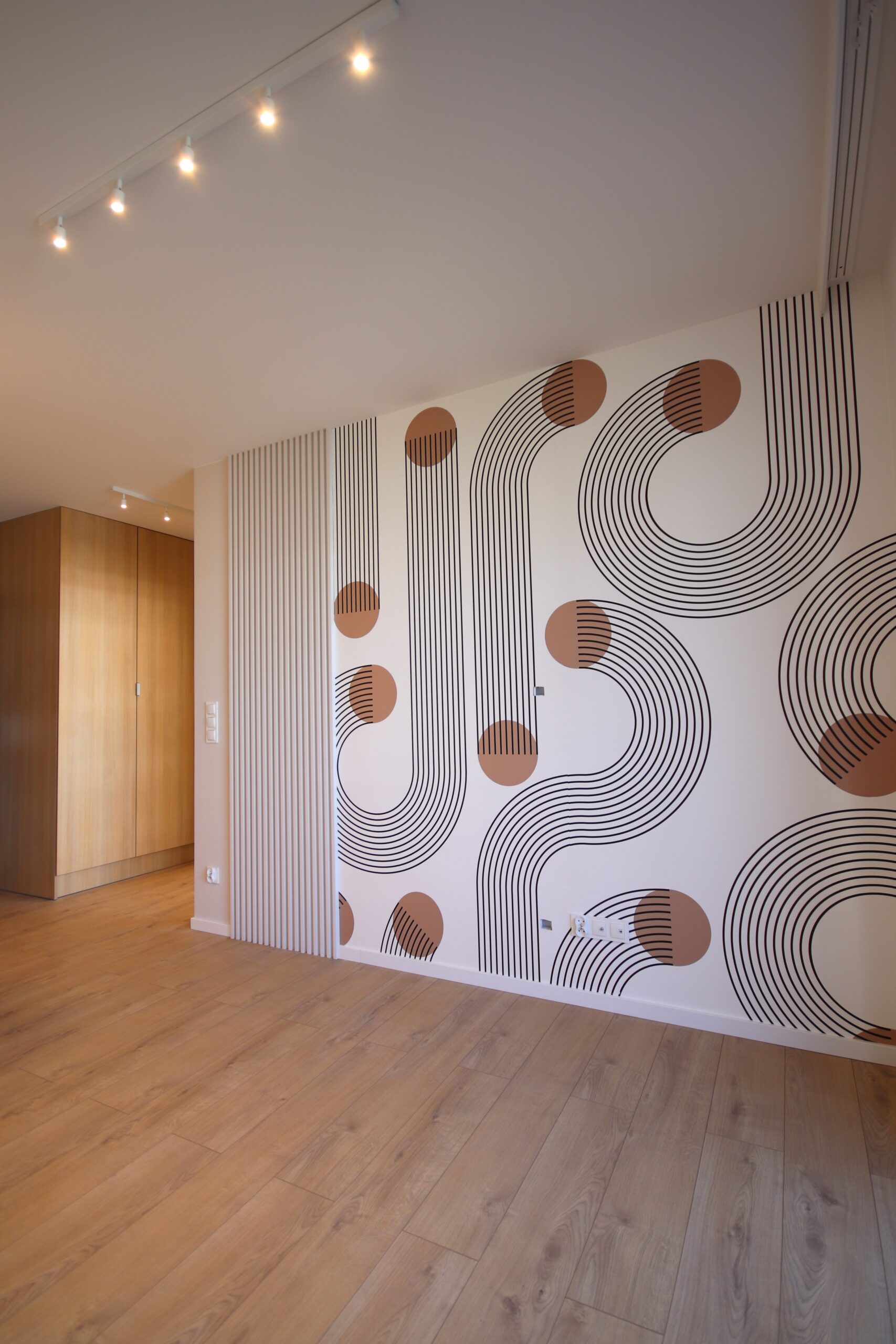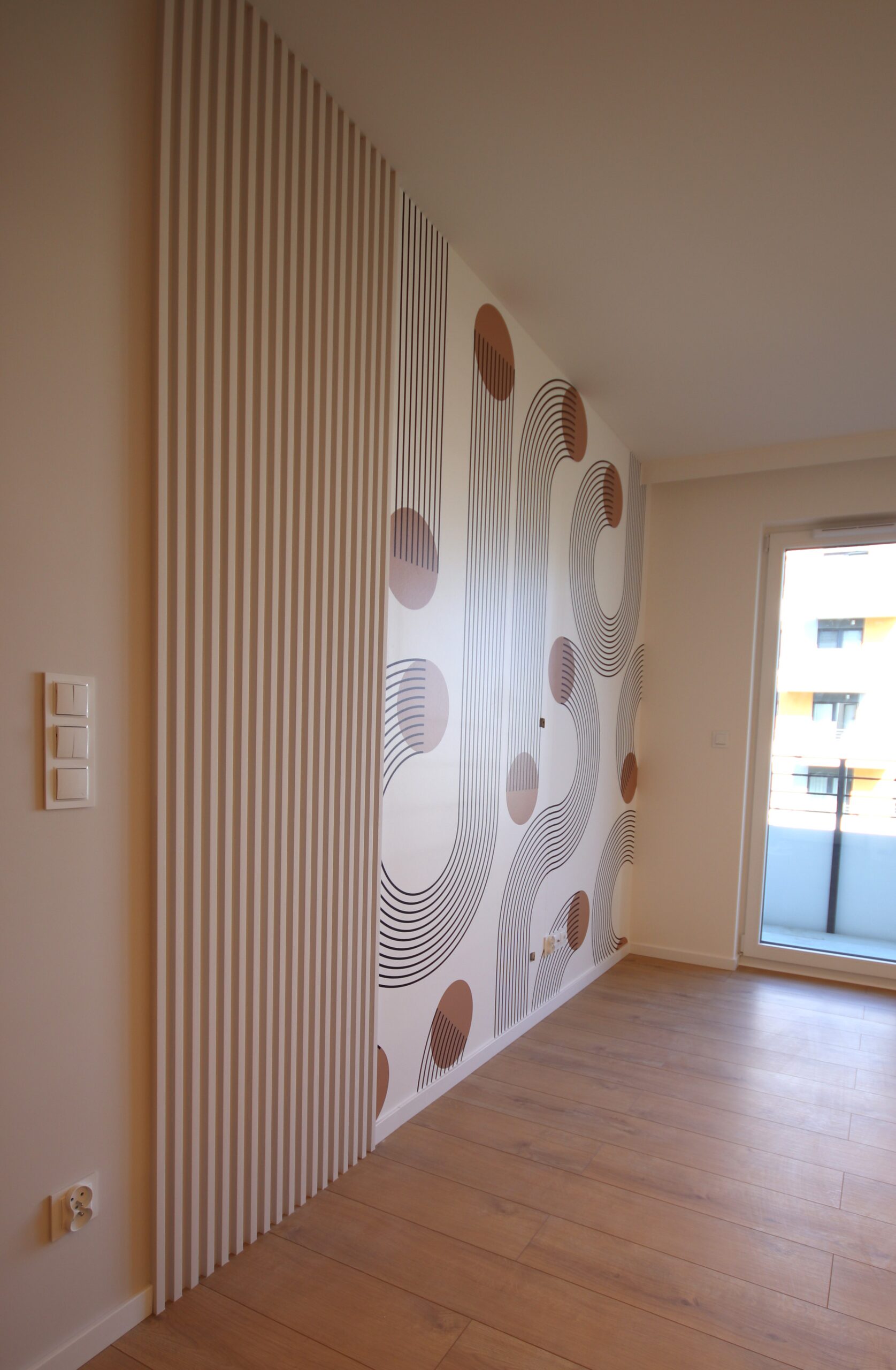 W projekcie mieszkania zastosowaliśmy tapetę Geosnake, która stanowi jeden z głównych akcentów dekoracyjnych w tym wnętrzu. Jej unikalny, geometryczny wzór doskonale komponuje się z nowoczesnym stylem mieszkania, dodając przestrzeni dynamizmu i elegancji. Tapeta o wyrazistej fakturze wprowadza subtelną grę świateł i cieni, nadając wnętrzu głębię bez przytłaczania. Zastosowanie tapety na głównej ścianie pozwoliło uzyskać punkt centralny wnętrza, który przyciąga wzrok i podkreśla jego charakter.