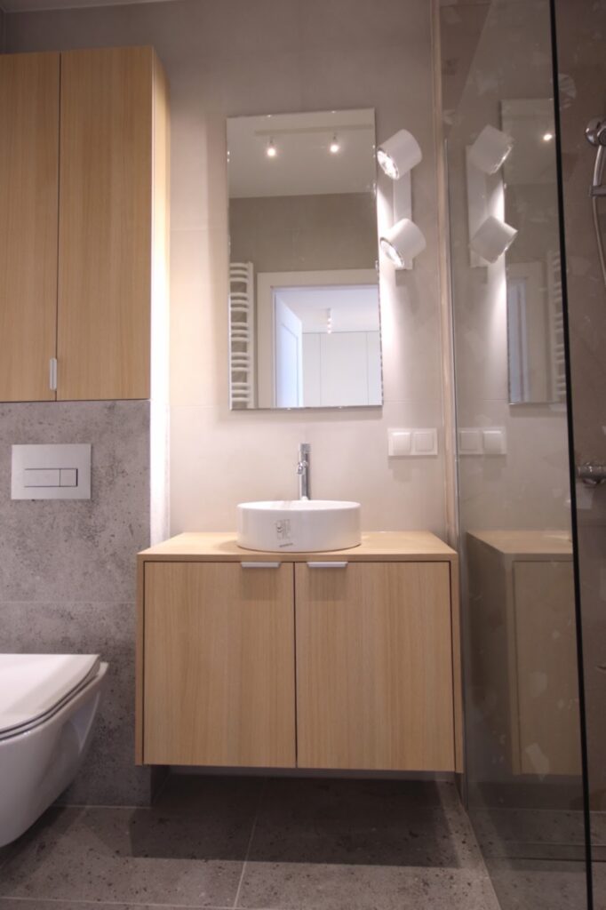 Łazienka w tym mieszkaniu została zaprojektowana z myślą o wygodzie i estetyce. Zastosowaliśmy ściankę walk-in, która optycznie powiększa przestrzeń i nadaje jej nowoczesnego charakteru. Prysznic z odpływem liniowym podkreśla minimalistyczną formę, a obudowa stelaża WC gresem zapewnia spójność materiałową i trwałość.