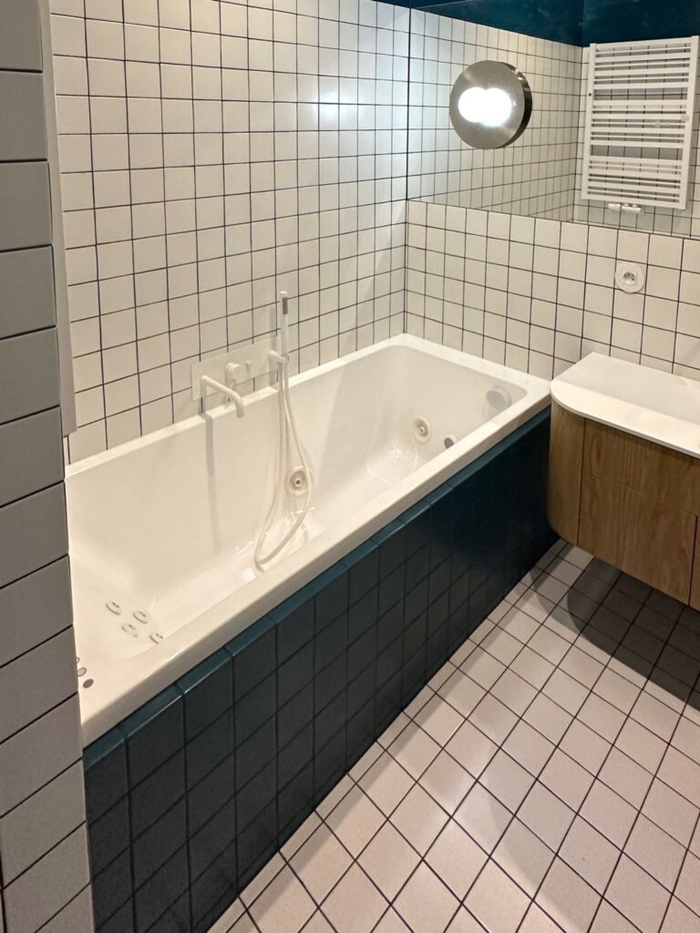 Tutaj postawiliśmy na coś więcej niż standard. Głównym elementem jest wanna z hydromasażem, która zmienia funkcję łazienki – z czysto użytkowej na relaksacyjną. Do tego kontrastowe zestawienie bieli i granatu, które nadaje wnętrzu głębi.