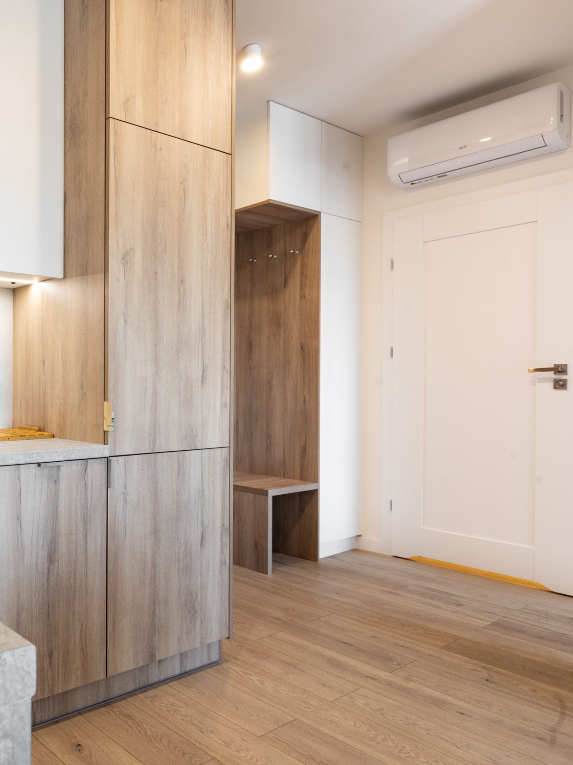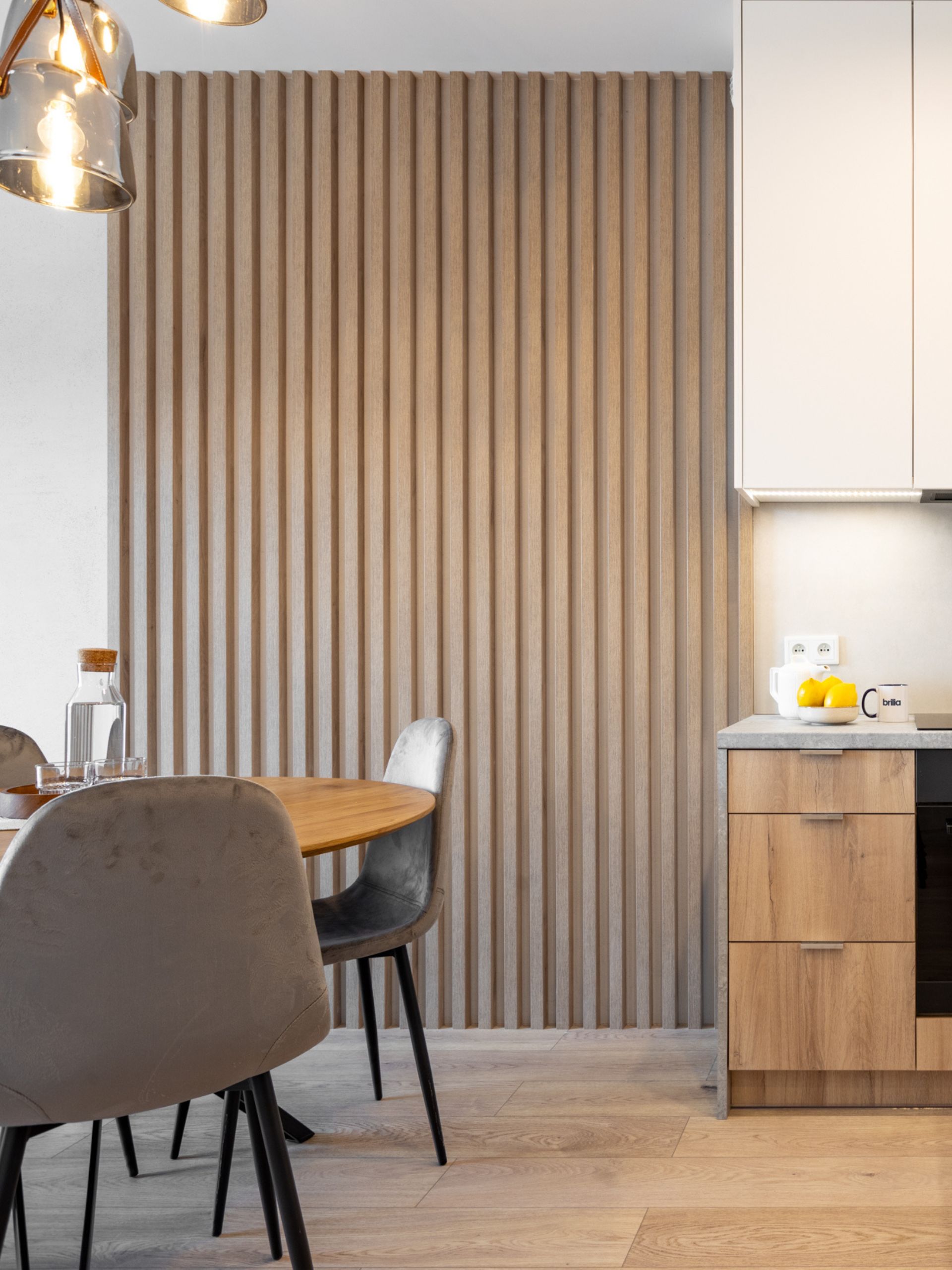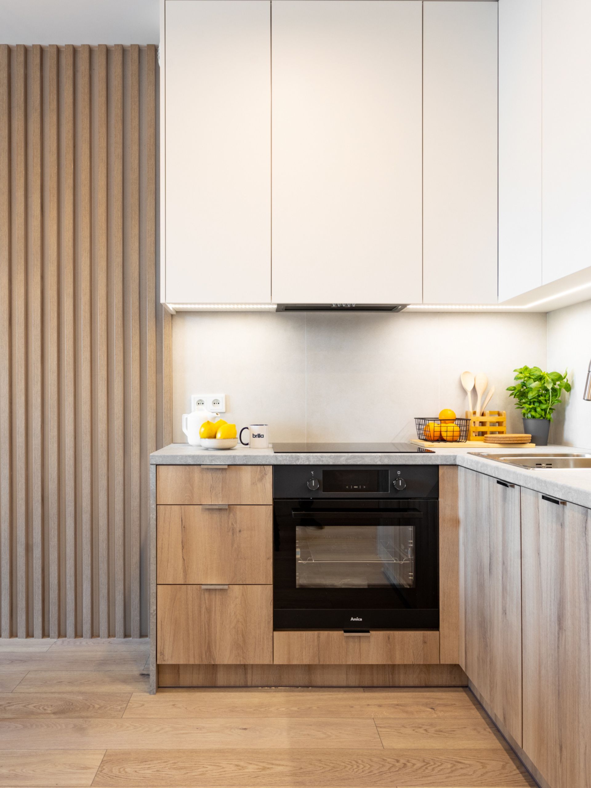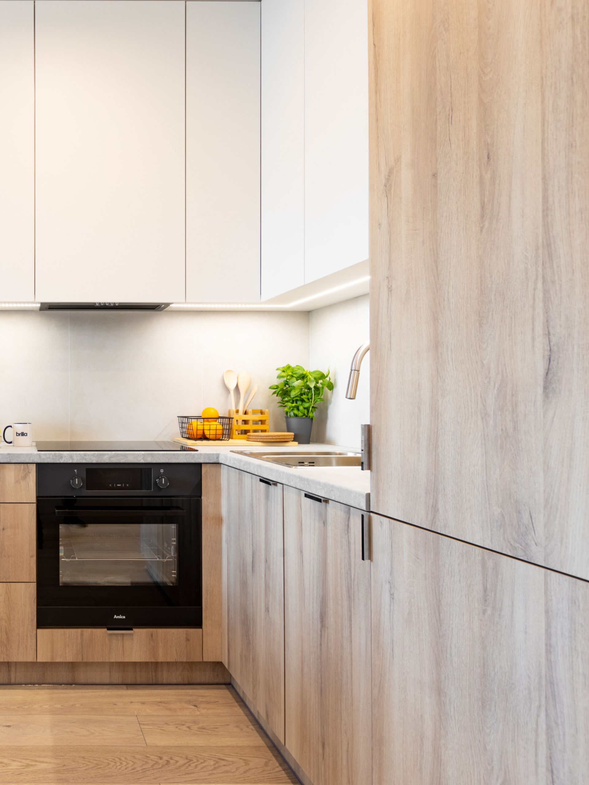 W części kuchennej dominują ciepłe odcienie drewna, które współgrają z białymi, minimalistycznymi frontami górnych szafek. Prosta forma mebli została uzupełniona o blat z imitacji kamienia oraz oświetlenie LED pod szafkami, które poprawia komfort pracy i tworzy przytulny klimat.