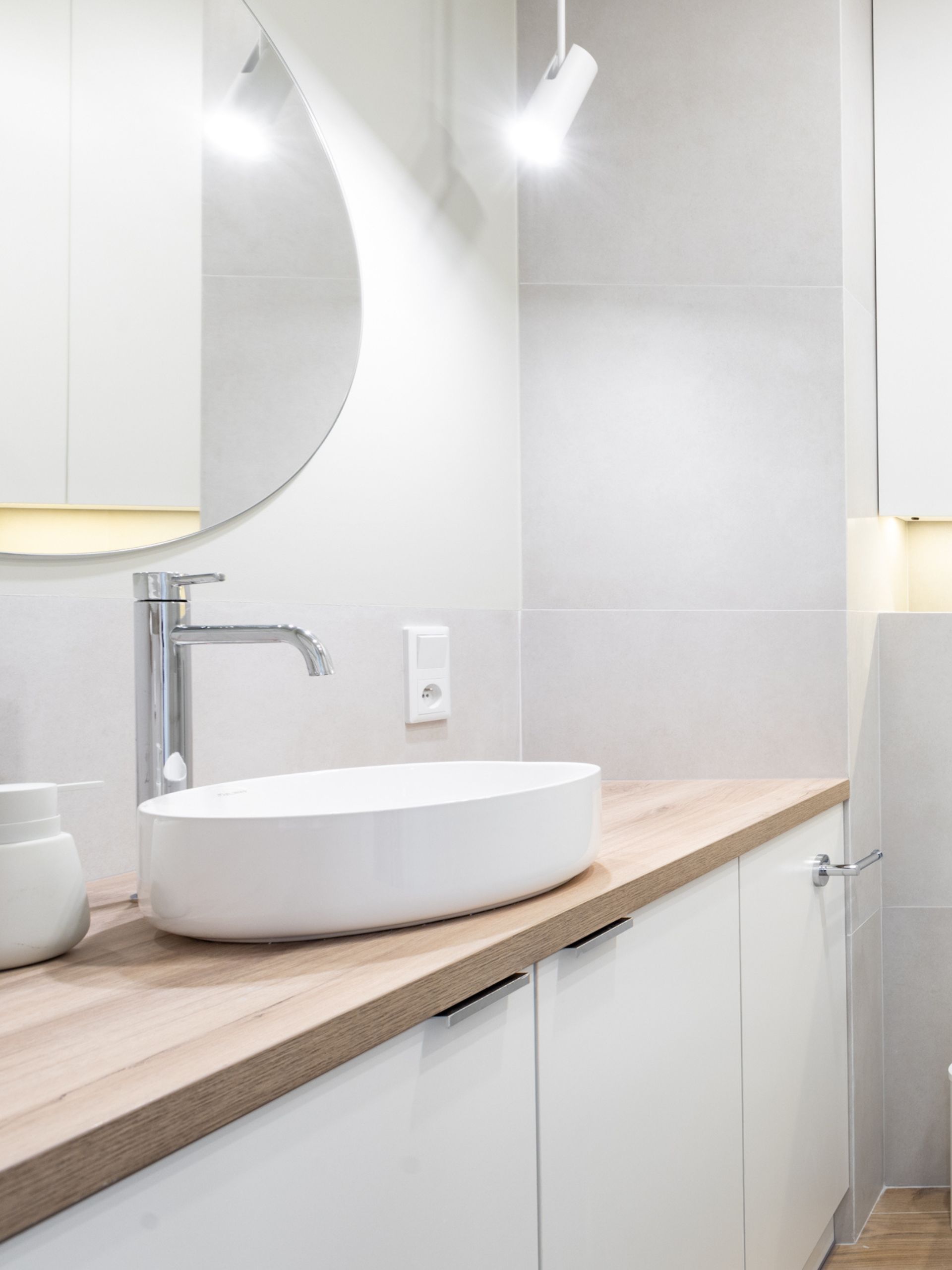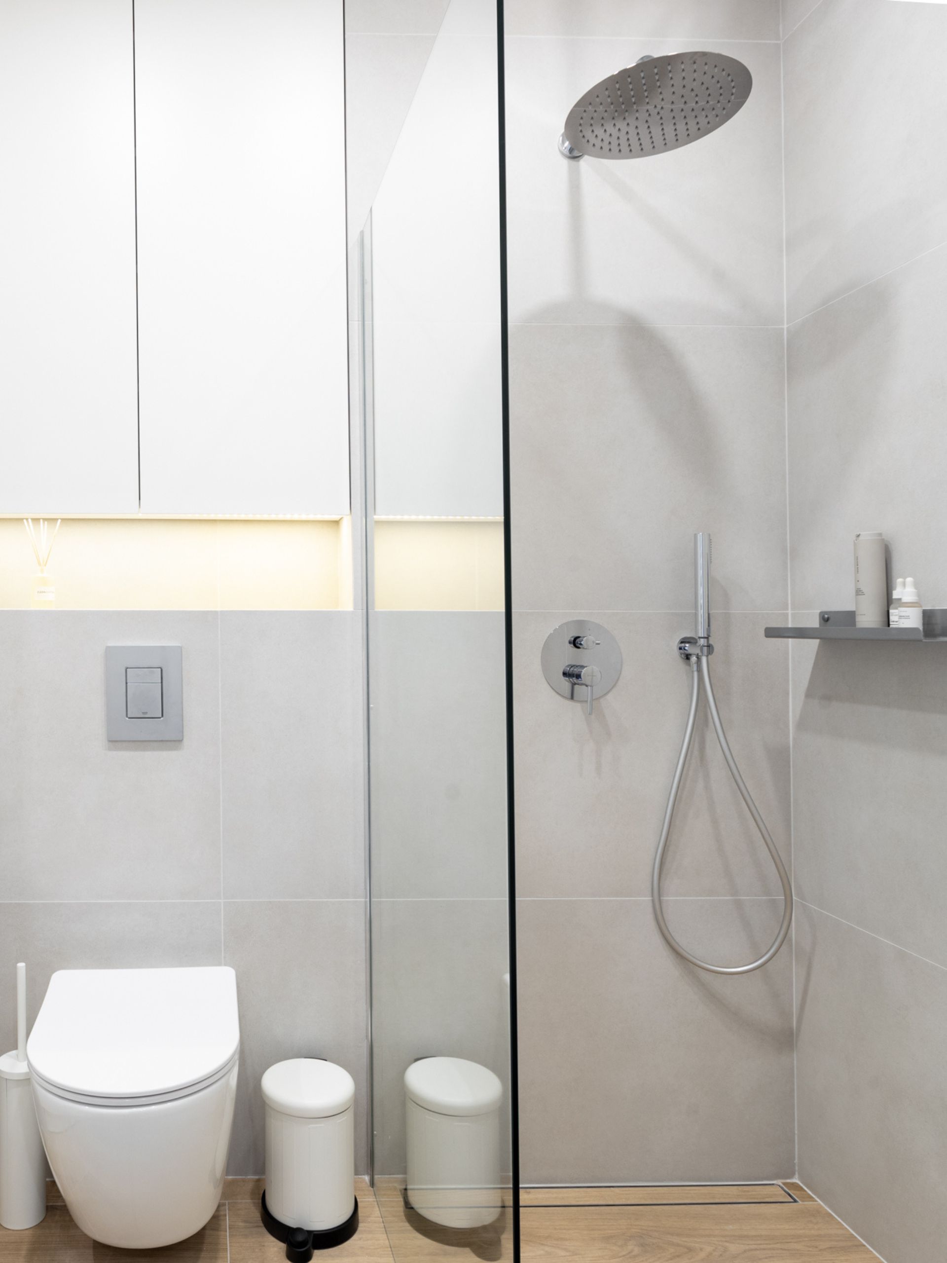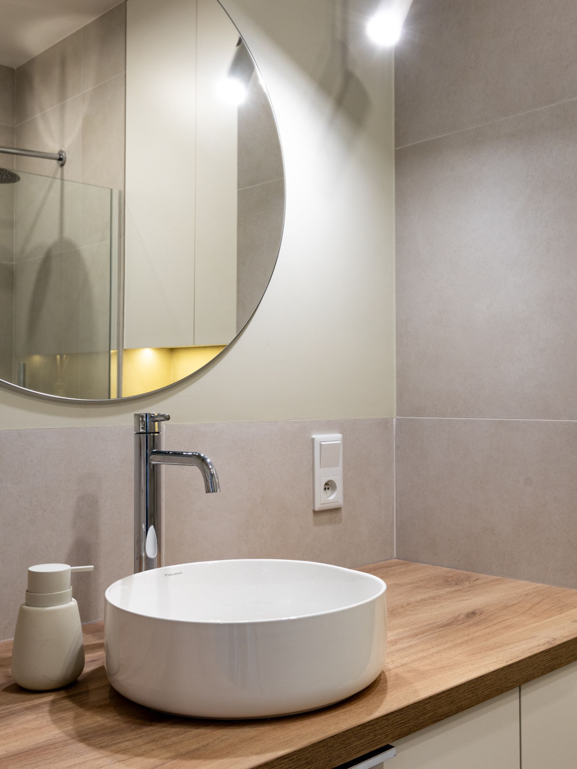 Łazienka została zaprojektowana z myślą o minimalizmie i optycznym powiększeniu przestrzeni. Znajdziemy tu jasne płytki, drewniany blat z białą ceramiką oraz prysznic typu walk-in z deszczownicą. Dodatkowym atutem jest LED-owe oświetlenie w zabudowie nad stelażem WC, które tworzy subtelny, relaksujący klimat.