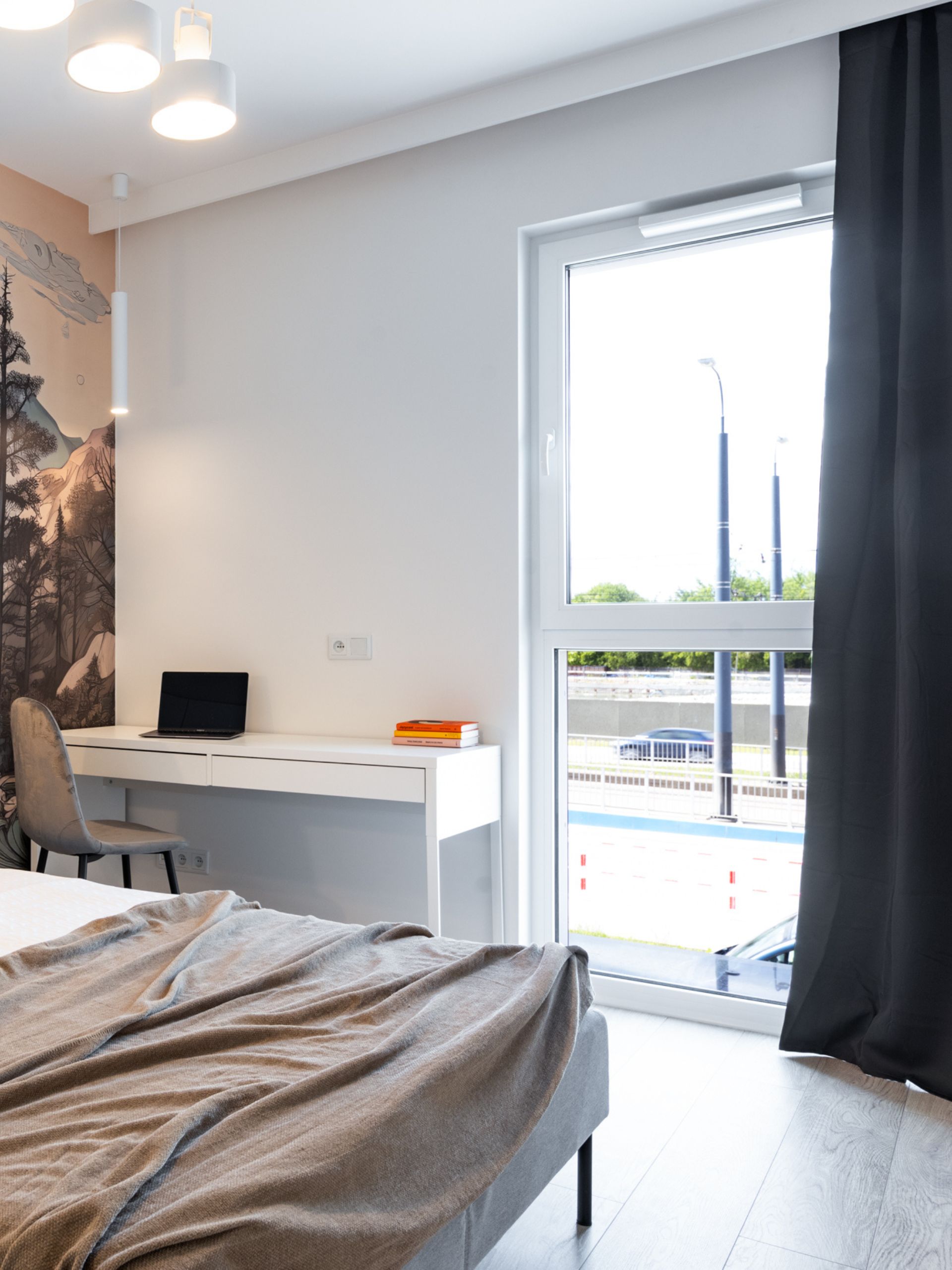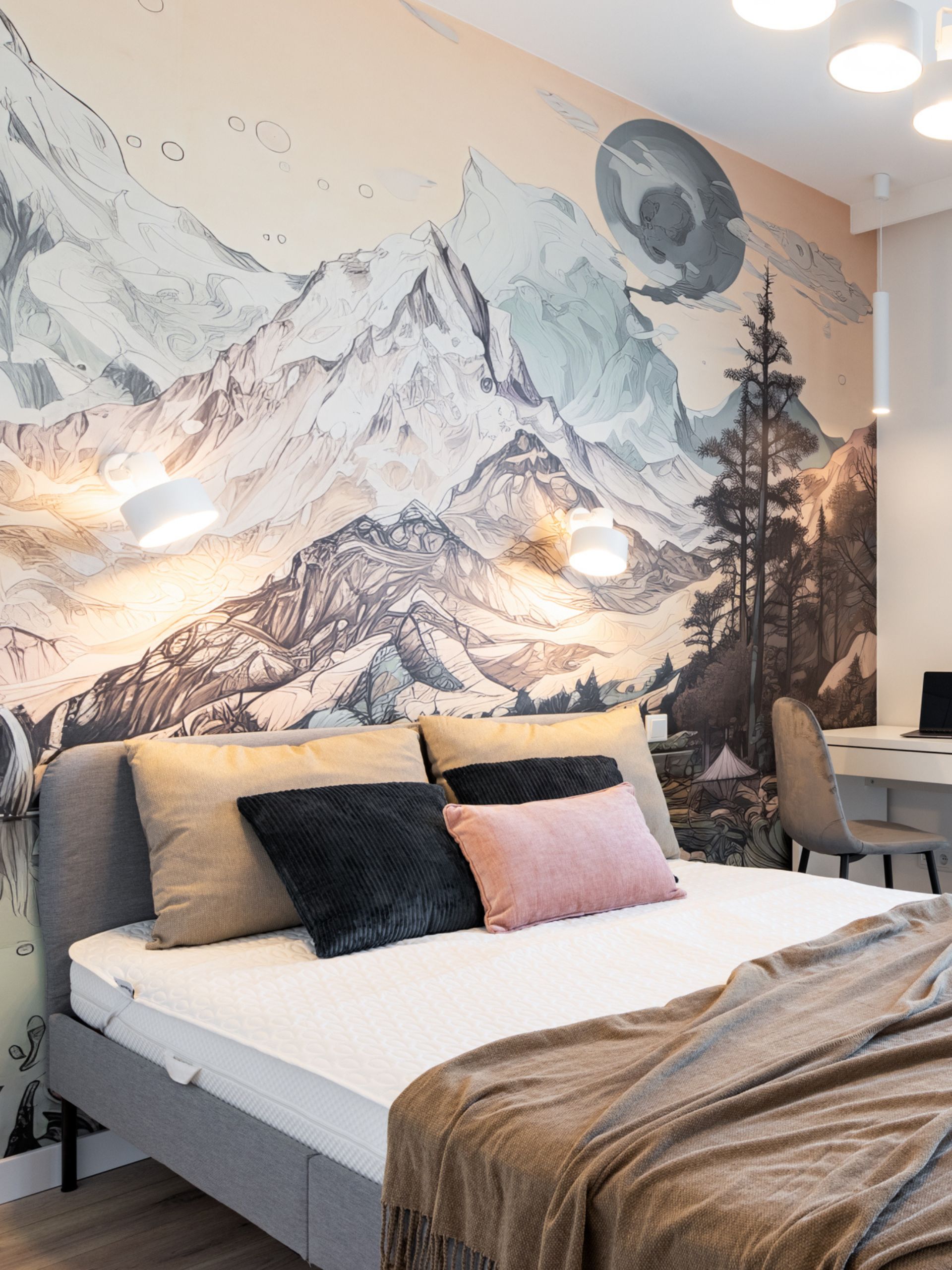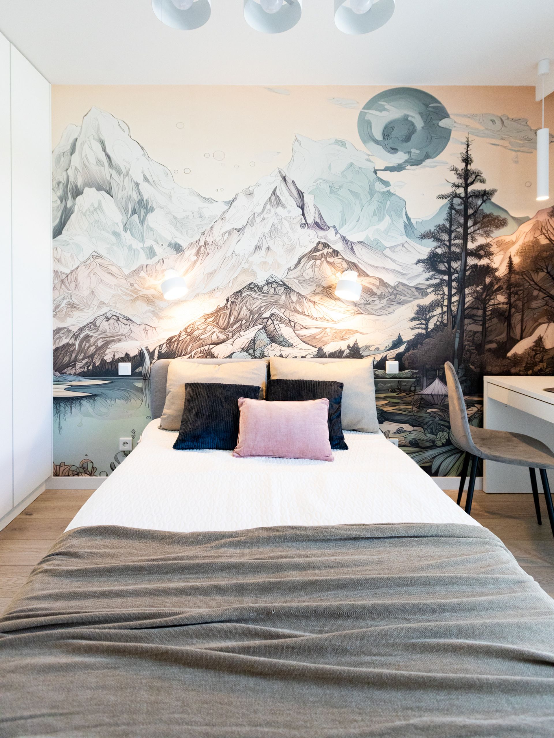 Głównym akcentem sypialni jest artystyczna tapeta z krajobrazem górskim, która rozciąga się na całą ścianę za łóżkiem. Dzięki niej wnętrze nabrało unikalnego, nieco bajkowego charakteru. Przemyślana organizacja przestrzeni – wbudowane biurko, zasłony blackout i zabudowy meblowe – zapewnia równowagę między estetyką a funkcjonalnością.